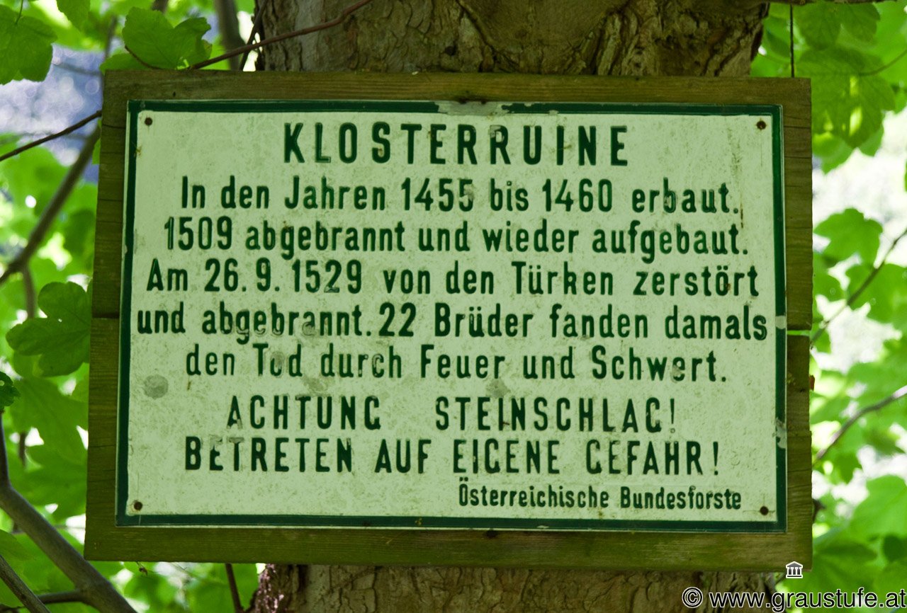 Das 1440/1460 gegründete Kloster Sancta Maria in Paradyso (auch Klosterruine Riederberg oder Sankt Laurentius im Paradies) wurde bei der ersten Türkenbelagerung 1529 komplett zerstört. Kirche und Kloster wurden nicht wieder aufgebaut, es sind aber noch meterhohe Mauerreste des Kirchenschiffes sichtbar.