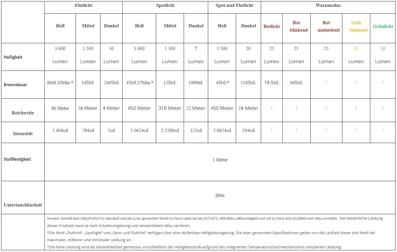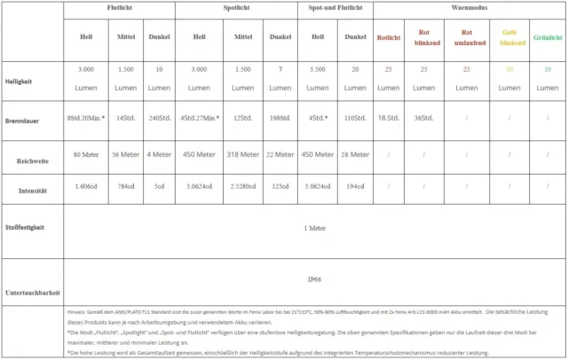 Beleuchtungsmodi: Drei Weißlichtmodi; stufenlose Helligkeitsstufen für Flutlicht, Spotlicht oder beides, plus fünf Warnleuchten