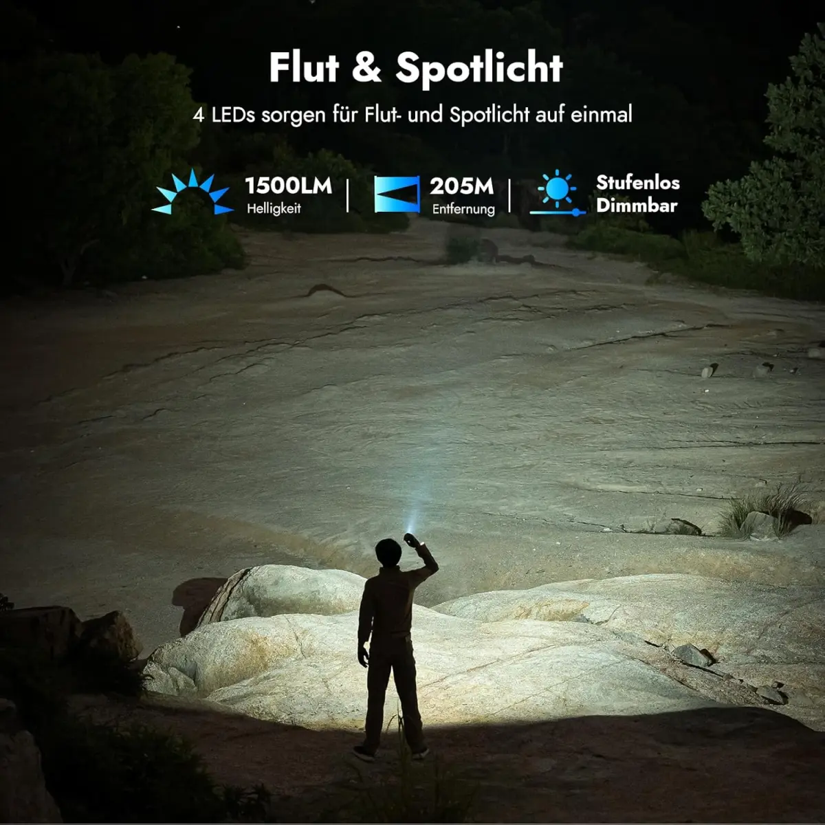 Leistungsstarkes Hauptlicht: Bis zu 1.500 Lumen mit anpassbarer Lichtstärke, Flut- und Spotlicht sowie einer Leuchtweite von 205 Meter.
