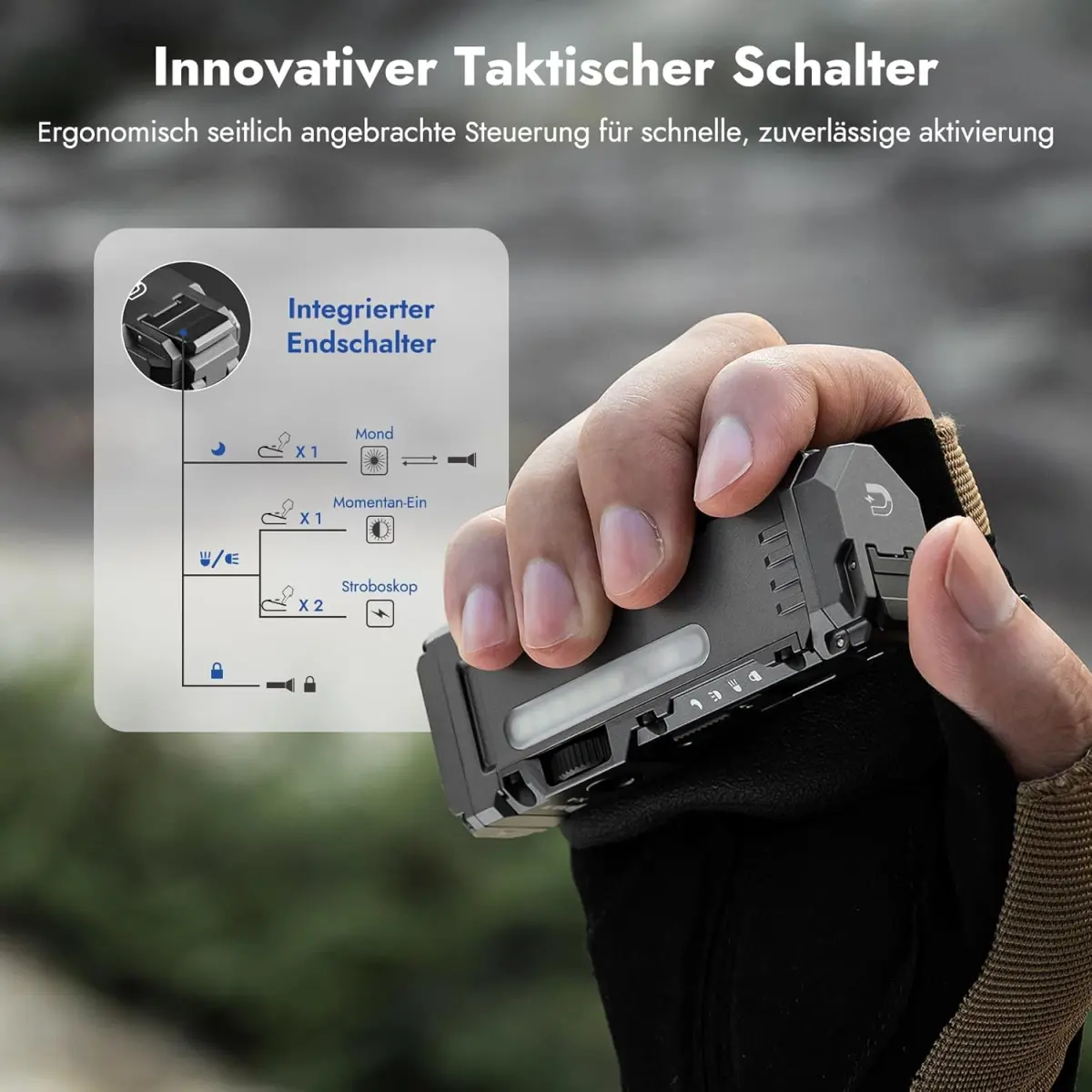 Taktischer Schalter: Ergonomischer Seitenknopf für schnelle und zuverlässige Aktivierung.